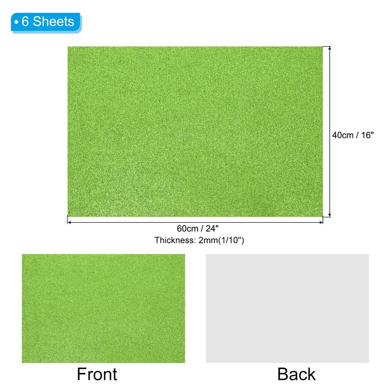 • Material: EVA; Color: Light Green; Overall Size: 40x60cmcm / 16x24inch Inch; Thickness: 2mm / 0.08inch; Package List: 6 Sheets x Glitter Foam Sheet