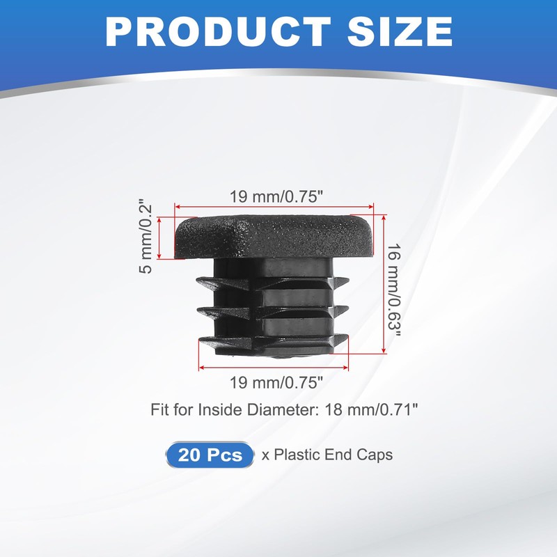 - Color: Black; Material: PE; Size: 19x19x16 mm/0.75x0.75x0.63 Inch(LxWxH); Head Thickness: 5 mm/0.2 Inch; Fit for Inside diameter of 18 mm/0.71 Inch tubing; Packing List: 20 Pcs x Plastic End Caps