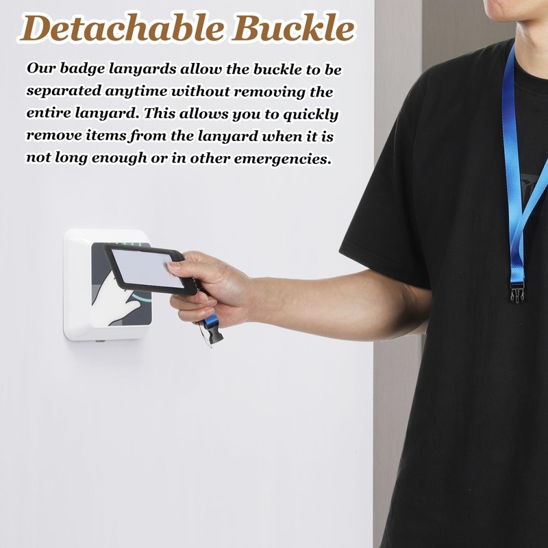 1. Our breakaway badge lanyards allow the buckle to be separated anytime without removing the entire lanyard. This allows you to quickly remove items from the lanyard when it is not long enough or in other emergencies.