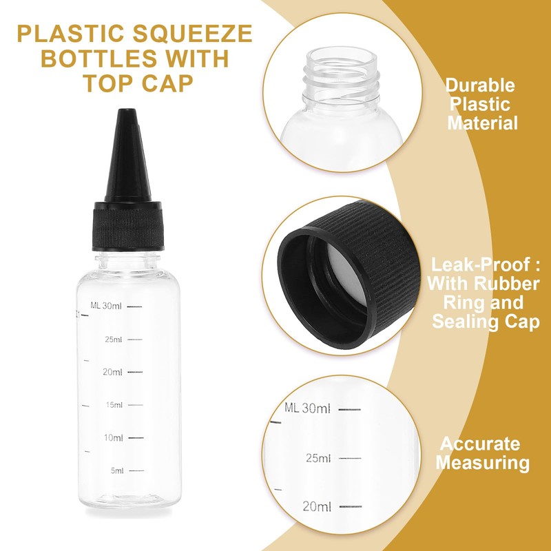 - Specification: Color: Transparent(Bottle Body); Black(Bottle Cap); Capacity:30ml/1.01OZ; Size: Bottle Diameter: 28mm/1.1Inch; Material: Plastic; Packing List: 4 Pcs x Plastic Squeeze Pointed Bottles