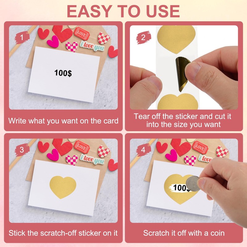 - Sticker Size: 25mm / 1 inch; Packing List: 1 roll x Heart Scratch Off Sticker (300 Stickers per roll)