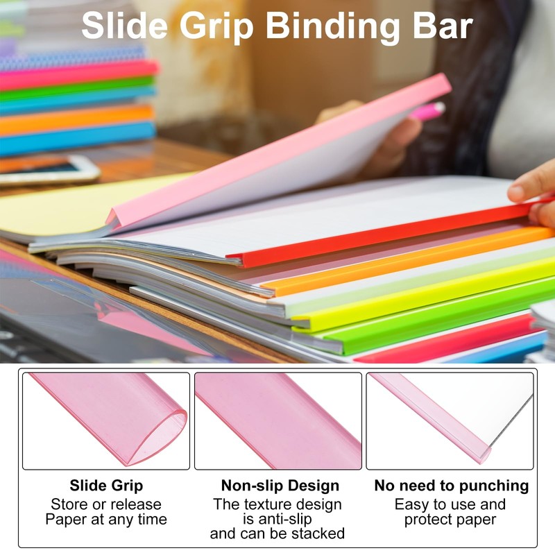 - Advantage: These binding bars are made of plastic, durable and reusable, and you can even cut them with scissors to fit your paper. They come in a variety of colors, so you can sort and organize your documents by using different colored binding bars. The binding bars' surface is specially treated as non-slip. The part that contacts the paper surface feels smooth and will not scratch your documents. The clamping force of these binding strips is very strong, and the documents will not fall off