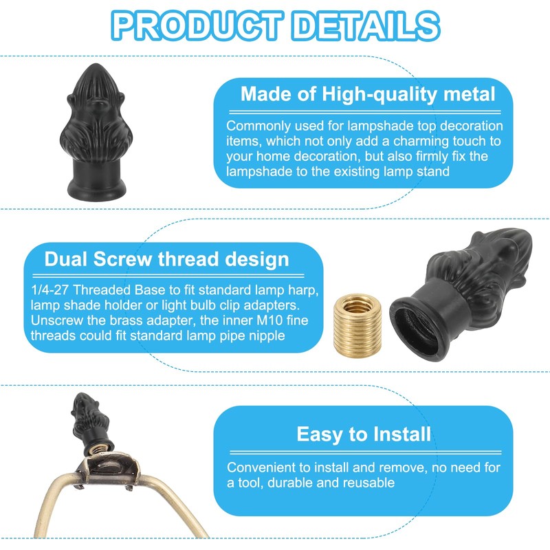 - Color: Black; Material: Metal, Solid Brass; Lamp Finial Size: 33 x 16mm / 1.3 x 0.63 inch (L*W); Lamp Finial Inner Thread Size: M10*1mm; Brass Adapter Thread Size: M10 Male to 1/4-27 Female; Packing List: 4 Set x Lamp Finials Kit
