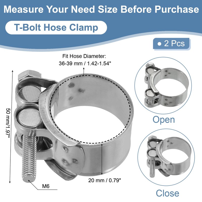 - Fit Hose Diameter: 36-39 mm / 1.42-1.54 inch; Total Size: 20 x 0.6 mm / 0.79 x 0.02 inch(W*T); Packing List: 2 x Hose Clamps (Note: Please measure the outside diameter of the pipe before purchasing our pipe clamp)
