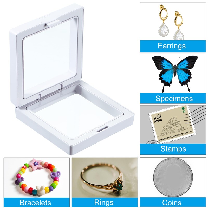 PATIKIL 3D Floating Frame Display Stand, 12 Pack 2.8x2.8 Inch Challenge Coin Display Stand Holder Transparent PE Jewelry Storage Box Floating Display Case with Base, White&Blue