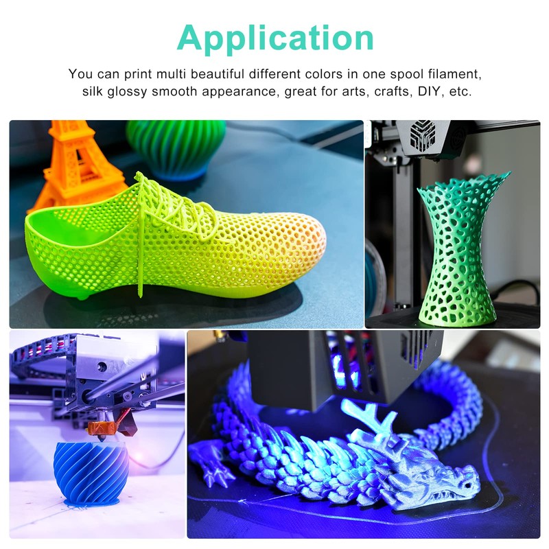 - Application: You can print multi beautiful different colors in one spool filament, silk glossy smooth appearance, great for arts, crafts, DIY, etc.