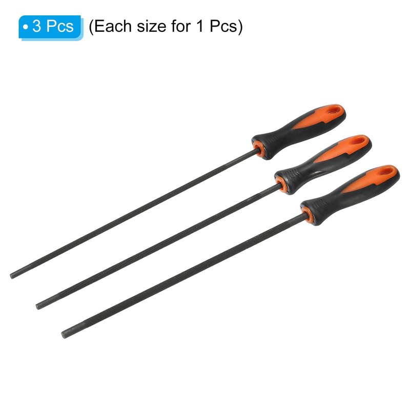- Material: steel; diameter: 4 mm/5/32 inches, 4.8 mm/3/16 inches, 5.5 mm/7/32 inches; working end length: 205 mm/8.1 inches; file length: 285 mm/11.2 inches; packing list: 3 x circular saw chain file (1 of each size)