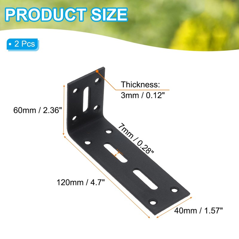- Color: Black; Material: Q235 Steel; Total Size: 120 x 40 x 60 mm / 4 18/25 x 1 3/5 x 2 9/25 Inch(LxWxH); Thickness: 3 mm / 3/25 Inch; Slot Hole Size: 30 x 7 mm / 1 9/50 x 7/25 Inch(LxW); Packing List: 2 Pcs x Adjustable L Bracket (Screws not included)