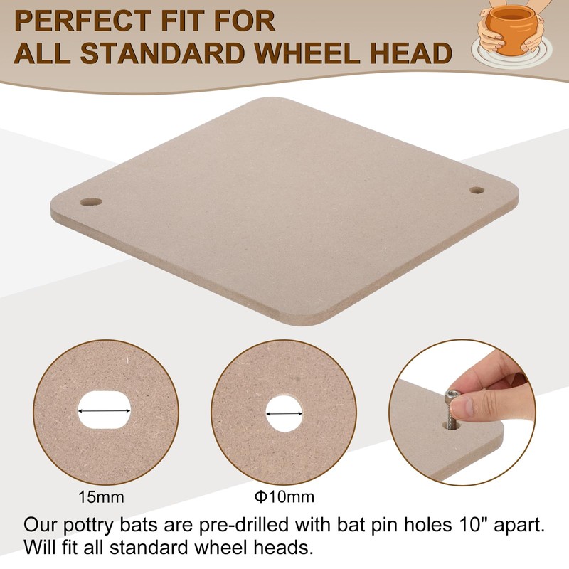 - COMPLETE ACCESSORIES - The pottery wheel bat comes with 4 sets, which include a pottery bat of 4 pcs, and pin screws of 8 pcs. Each pottery wheel bat measures 9" x 10" x 1"/230mm x 254mm x 25.4mm(Bat Diameter x Pin Holes Apart x Pin Length), Material: wood density board, Color: brown, Shape: Square.