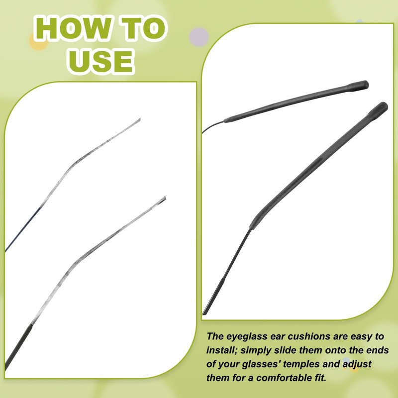 - Instruction: The eyeglass ear cushions are easy to install; simply slide them onto the ends of your glasses' temples and adjust them for a comfortable fit. Eyeglass cushions are a versatile solution for anyone looking to improve the comfort and security of their glasses.