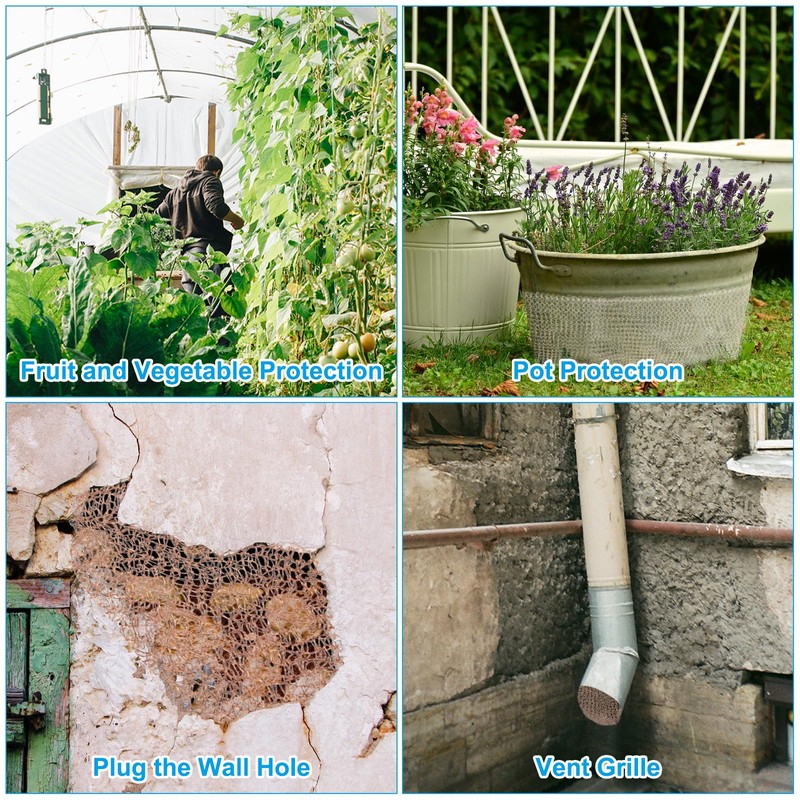 - Application: This wire mesh is great for sealing drain holes, sewers, pipe vents, walls, etc. in homes, houses, office buildings, gardens, yards, etc., for blocking holes and filling gaps to prevent unwanted guests from entering. Can also be used as a cover bag to protect your seedlings, vegetables, and fruits. Copper mesh is also great as a pan-cleaning brush.
