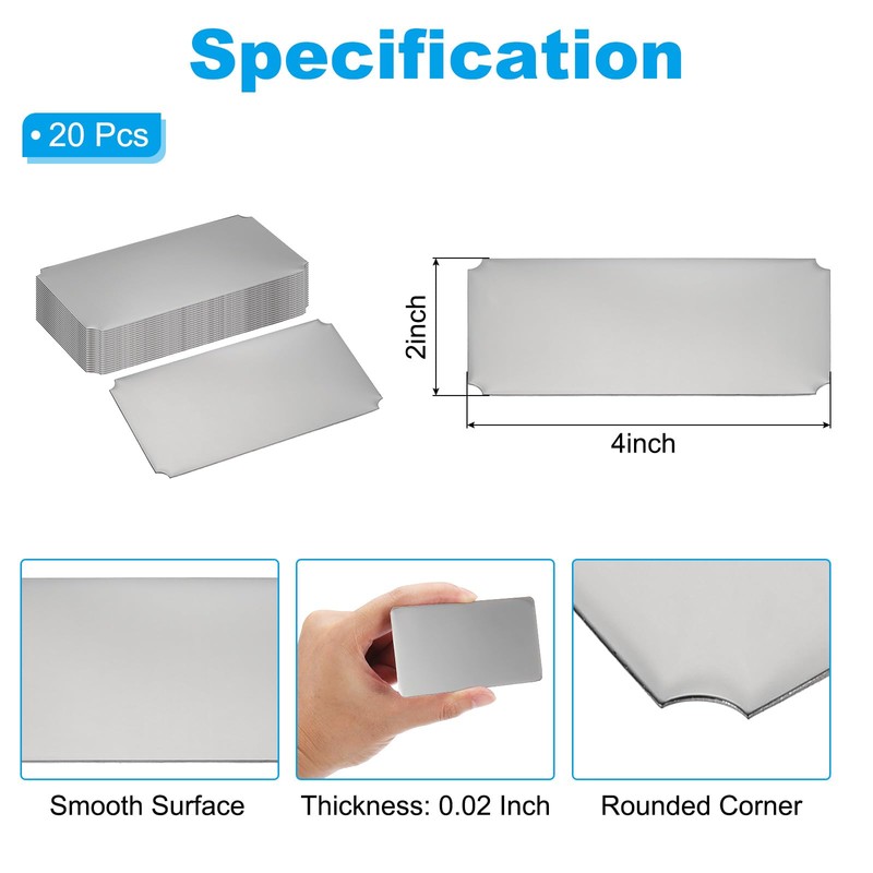 - Color: Black; Material: Stainless Steel; Thickness: 0.02 Inch; Size: 4x2 inch (L*W); Packing List: 20 x Blank Name Plates