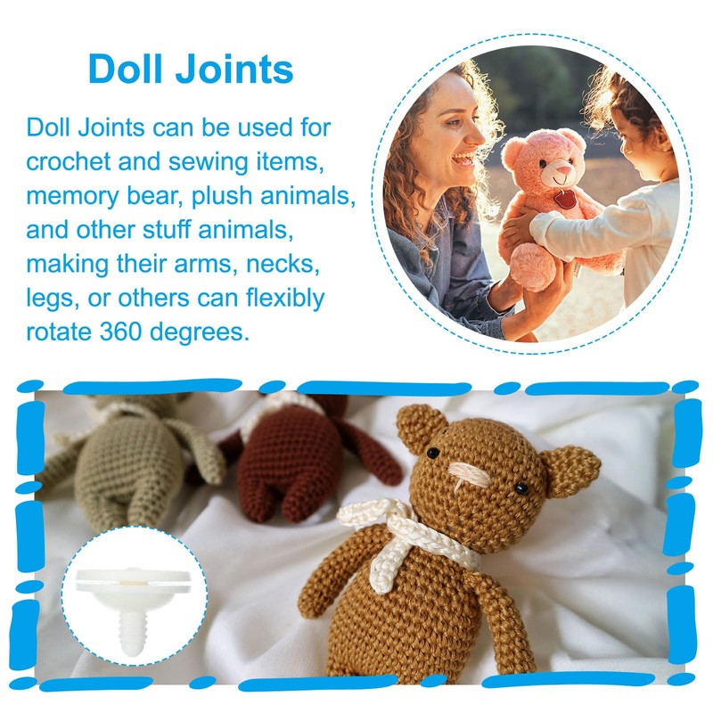 • The doll joints are important accessories for making and modifying dolls, perfectly applied to dolls to make their movements more realistic. Doll Joints can be used for crochet and sewing items, memory bear, plush animals, and other stuff animals, making their arms, necks, legs, or others can flexibly rotate 360 degrees.