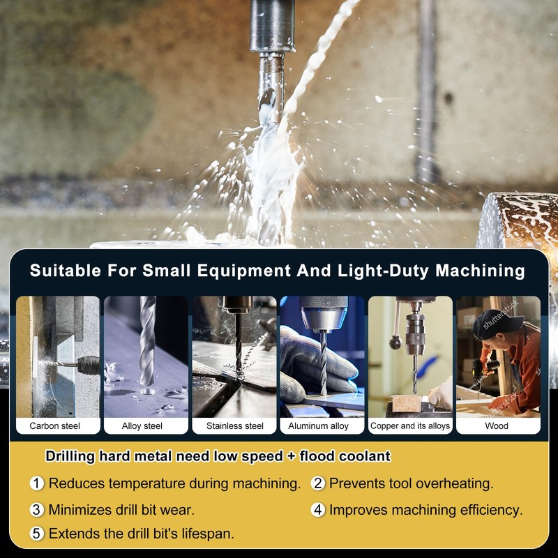 The 4341 hss drills are suitable for light-duty machining; applicable to low-carbon steel, aluminum alloy, brass, cast iron, medium-carbon steel, stainless steel, acrylic, plastic, wood, etc. For machining thicker metals, low RPM + flood coolantare required.