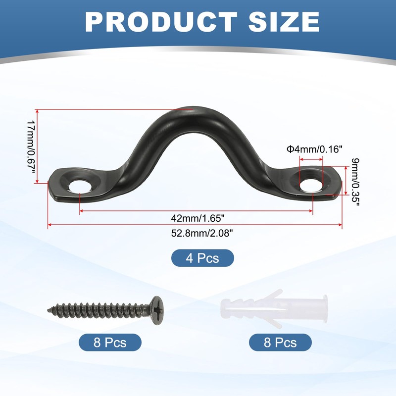 - Color: Black;Material: Stainless steel;Mounting Hole distance: 42mm/1.65inch;Bore diameter:4mm/0.16inch;Total Size: 52.8x9x17mm / 2.08x0.35x0.67inch;Packing List: 4 x Hooks for Hanging, 8 x Screws