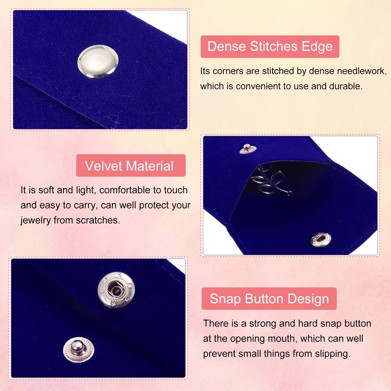 - Advantage: Made of velvet, it is soft and light, comfortable to touch, and easy to carry, it can well protect your jewelry from scratches. Dense Stitches Edge: Its corners are stitched by dense needlework, which is convenient to use and durable. Snap Button Design: There is a strong and hard snap button at the opening mouth, which can well prevent small things from slipping