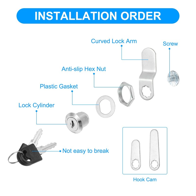 • Advantage: 90-degree rotation to open. Cam lock has a chrome-plated surface, is waterproof and rustproof, and has a long service life. Cabinet locks come as a complete set, each with 2 thickened locking arms to meet your installation needs.