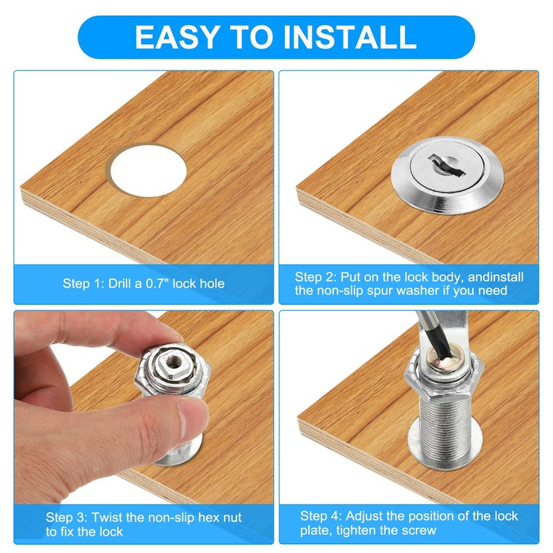 • Instruction: Cabinet Locks with Keys are quick and easy to install, they can be fitted to metal or wooden panels and turned 90 degrees clockwise to lock the door and unlocked in position to remove the key.