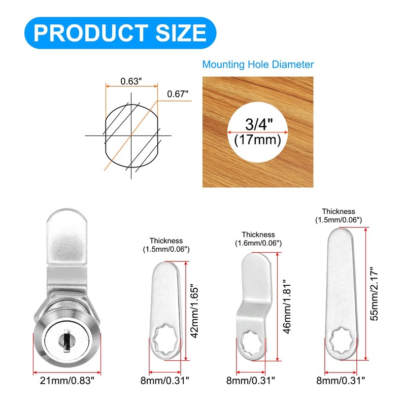 • Size: Color: Silver; Material: Zinc Alloy; Size: 16 x 21 mm/0.63 x 0.83 Inch(LxW); Mounting Hole Diameter: 16 mm/0.63 Inch; Straight Cam 1: 42x1.5 mm/1.65 x 0.06 Inch; Straight Cam 2: 55x1.6 mm/2.17 x 0.06 Inch; Depth Cam: 46x1.5x8 mm/1.81 x 0.06 x 0.31 Inch; Package List: 6 x Keyed Alike Cabinet Locks(2 Keys Per Lock)