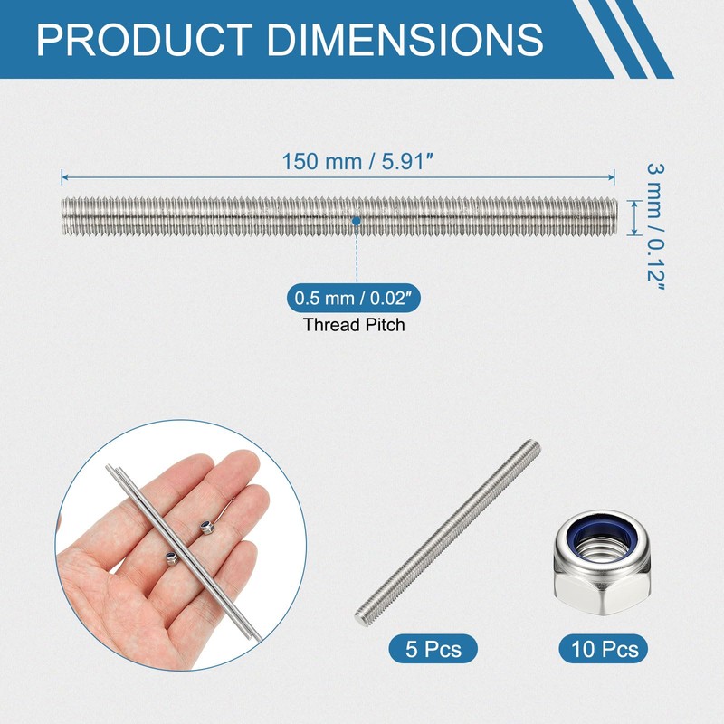 - Thread Dia: 3 mm / 0.12 inch; Total Length: 150 mm / 5.91 inch; Thread Pitch: 0.5 mm / 0.02 inch; Packing List: 5 Pcs x Threaded Rod (Each piece comes with two self-locking nuts) (NOTE: During use, regular inspection and maintenance are required, such as timely replacement and repair if looseness, deformation, corrosion and other problems are found)