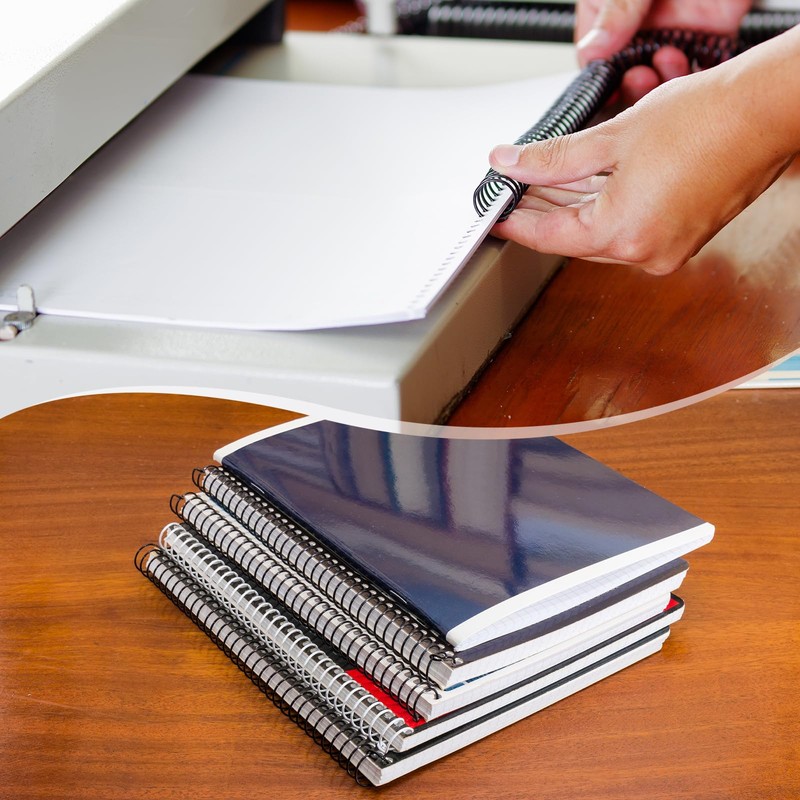 - Instruction: Arrange the punched paper neatly, screw the head of the binding ring into the first hole of the paper first, and then use the coil binding machine to complete the binding