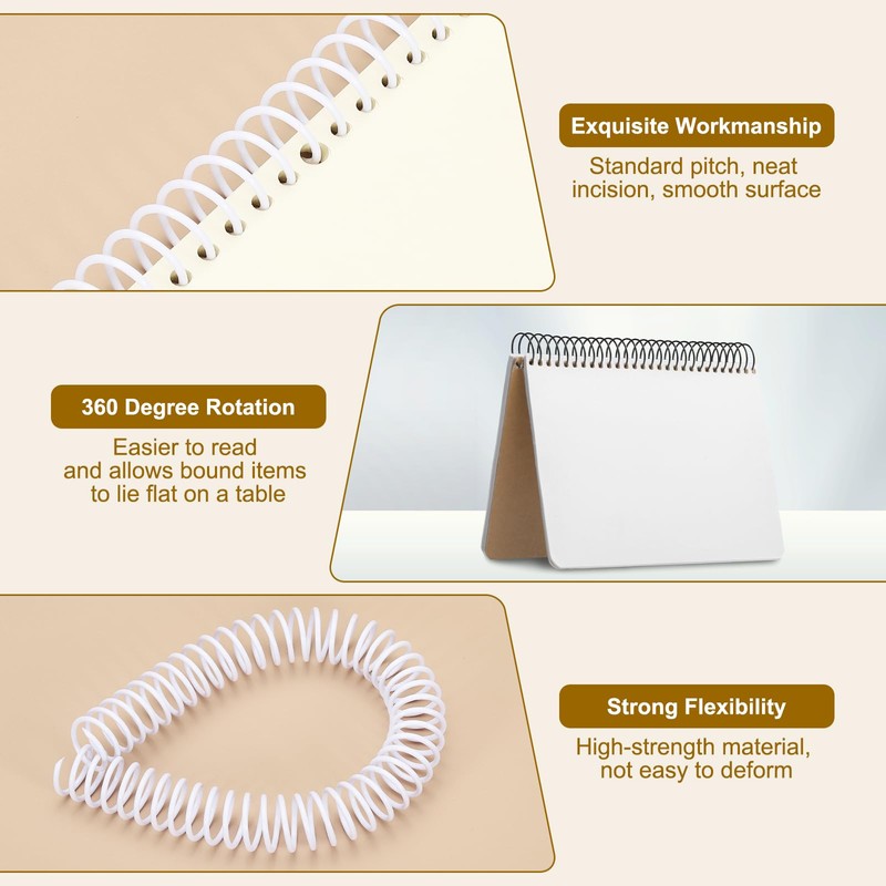 - Advantage: Our spiral binding coils are made of plastic, with fine workmanship, strong flexibility but not easy to deform, flat cuts, and easy to install. The surface of the binding coils has been specially treated, smooth and glossy, and not easy to oxidize. Plastic spiral binding coils can help you organize messy desktop documents, keep your desk tidy, and allow you to bind papers and preserve them for a long time easily. The plastic spiral binding coil offers 360-degree page rotation