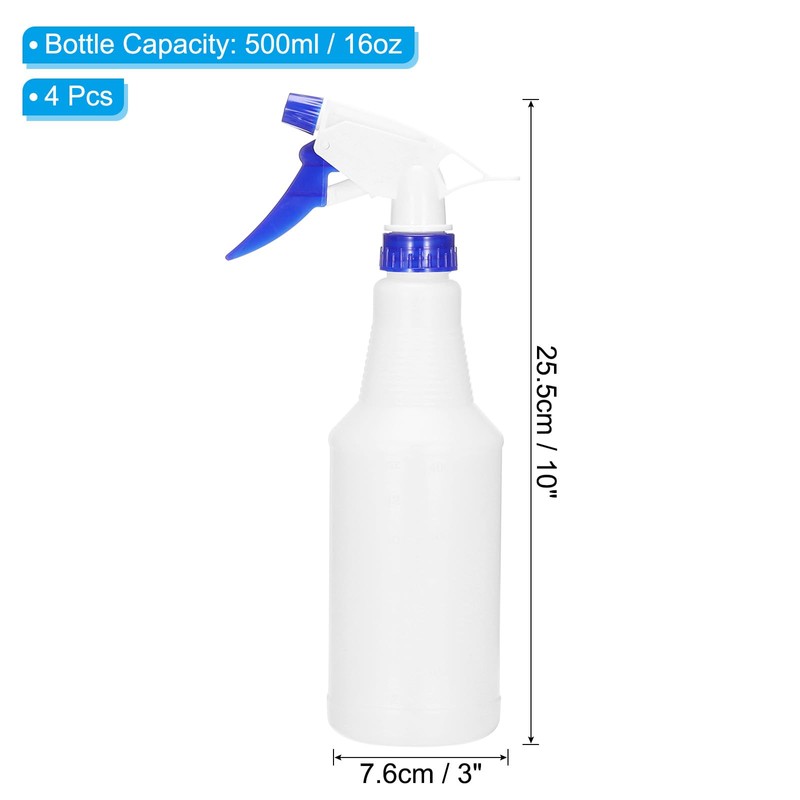 - Color: Dark Blue, White; Material: Plastic; Bottle Capacity: 500ml/16oz; Total Dia.: 7.6cm / 3 inch; Total Height: 25.5cm / 10 inch; Suitable for bottle neck type: 28-410; Packing List: 4 x Spray Bottles