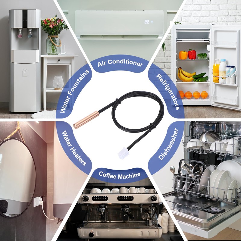 - Application: These temperature sensor probes are widely used in air conditioners, refrigerators, freezers, water fountains, dishwashers, dryers, drying boxes, constant boxes, water heaters, and air heaters for measuring, controlling, and fast-conducting temperature. It is also widely used in Greenhouses, aquariums, and other temperature control systems