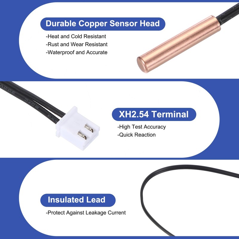 - Advantage: The copper sensor head is rust-resistant, wear-resistant, waterproof, and moisture-proof. With high accuracy and strong thermal conductivity, it can effectively measure temperature and provide quick responses; The lead is made of insulation material that protects against leakage current, ensuring safety.