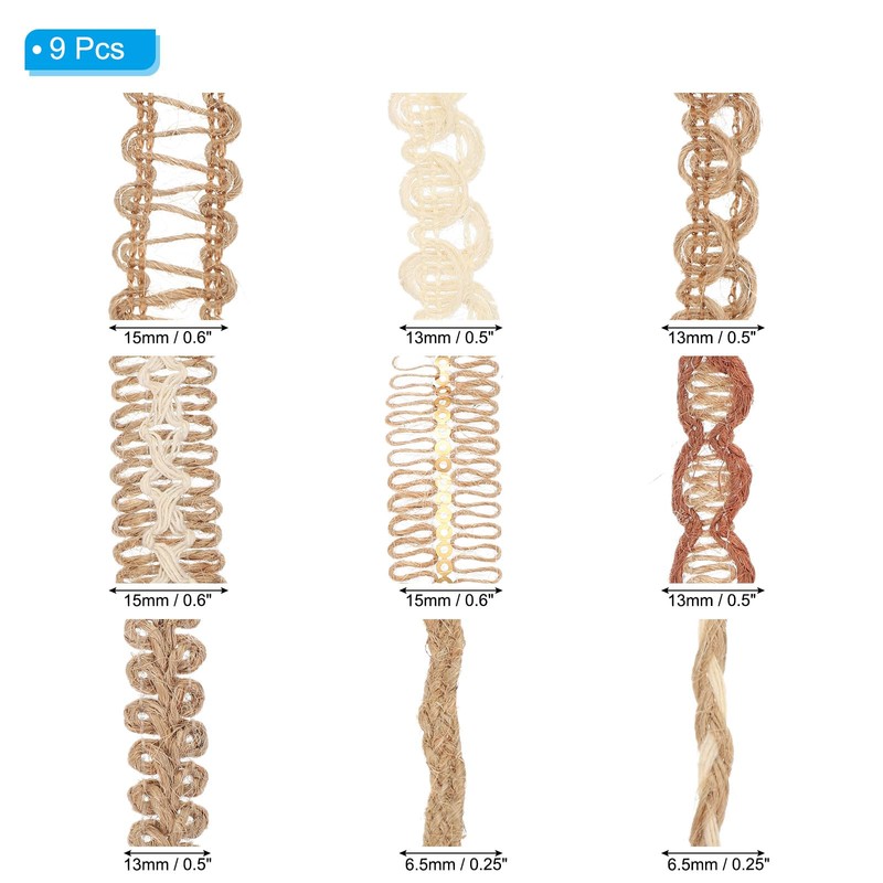 - Color: Natural; Material: Imitation Jute Rope; Width: 6.5mm / 0.25 inch, 13mm / 0.5 inch, 15mm / 0.6 inch; Length (Each Roll): 2m / 6.6 feet; Packing List: 9Rolls x Jute Ribbon Lace Craft Ribbon