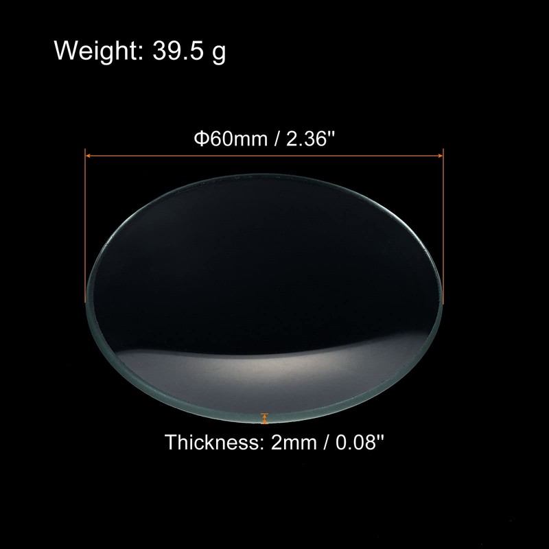 - Color: Clear; Material: Glass; Diameter: 60 mm; Thickness: 2 mm; Weight: 39.5 g; Package Content: 3 x Watch Glass
