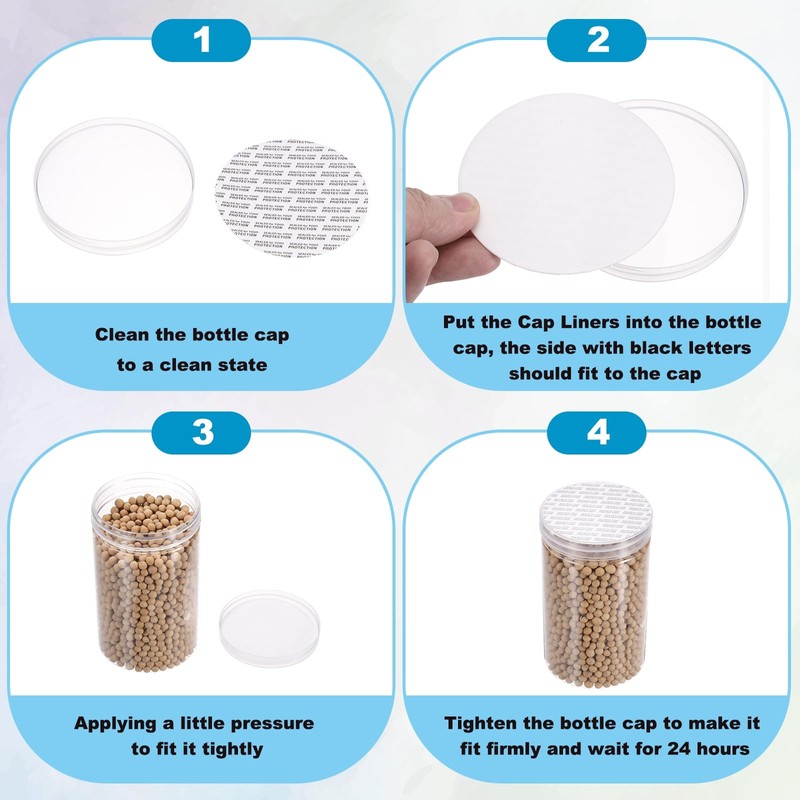 - Instruction: Clean the bottle cap to a clean state, put the Cap Liners into the bottle cap, the side with black letters should fit tightly against the bottle cap, and the white side should face down. After applying a little pressure to make it fit tightly, tighten the bottle cap and wait for 24 hours. Once removed, its sealing will be affected when used again.