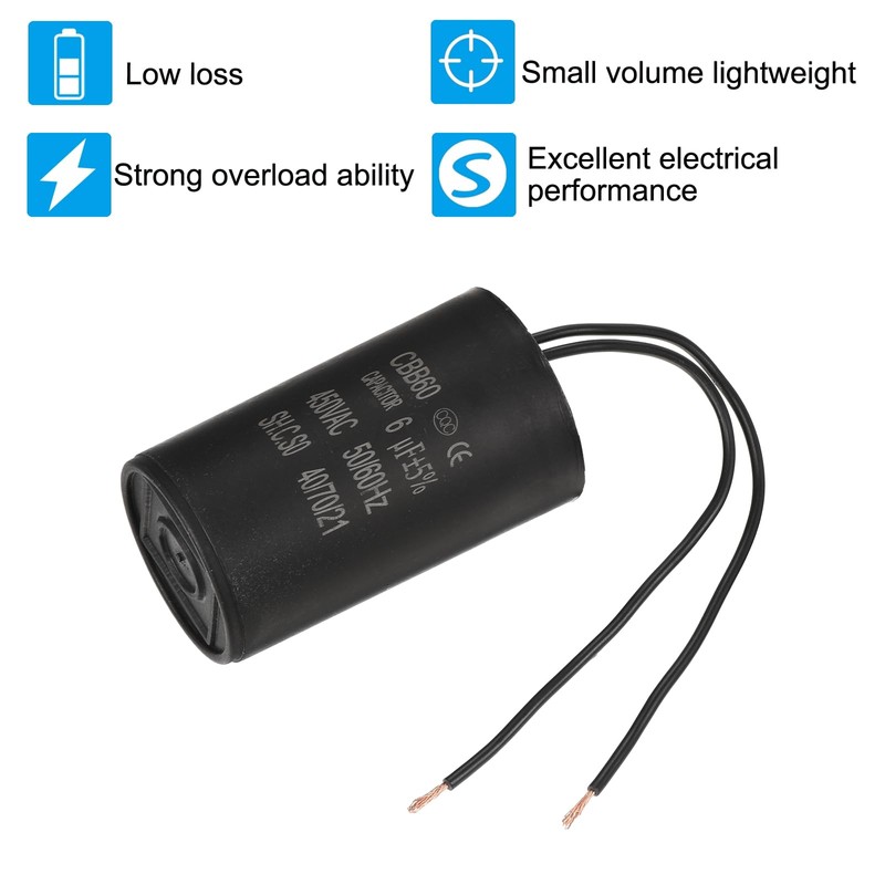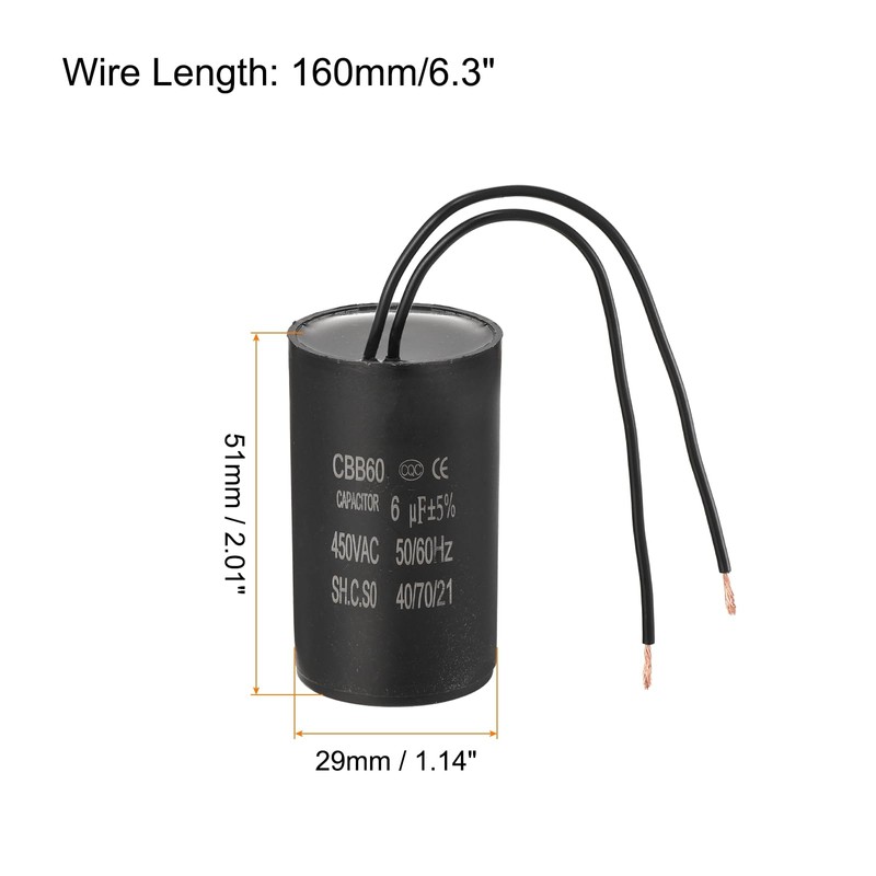 - Specification: Model: CBB60; Shell Color: Black; Material: Plastic Shell; Tolerance: ±5; Rated Capacity: 6uf; Rated Voltage: 450v; Wire Length: 160mm/6.3 inch; Climatic Category: 40/70/21; Body Size: 51x29x51/2.01x1.14x2.01 (LxWxH); Pack of 5 Pcs Run Capacitor