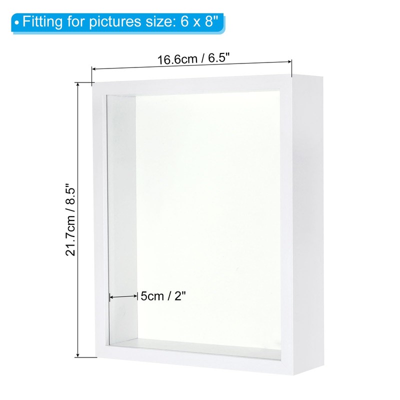 - Color: White; Material: Acrylic, Wood; Fitting for pictures size: 6 x 8 inch; Size: 8.5 x 6.5 x 2 inch/21.7 x 16.6 x 5cm(L*W*T); Packing List: 1Pcs x Shadow Box Frame