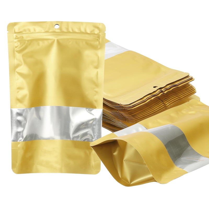PATIKIL 7.09x10.24 in Stand Up Pouch Bags, 60 Pack Resealable Matte Metallic Aluminum Foil Bags Pouches with Clear Window and Zip for Food Storage Snack Packaging, Gold Tone