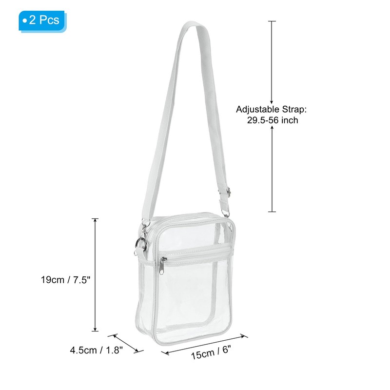 - Color: White; Adjustable Strap: 29.5-56 inch; Overall Size: 19x15x4.5cm / 7.5x6x1.8 inch; Packing List: 2Pcs x Clear Purse Bag