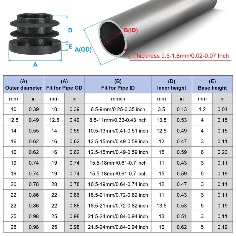 - Color: Black; Material: PE; Size: 22x15mm/0.86x0.59inch(L*H); Thickness: 5mm/0.19 inch; Fit for Inside diameter of 18.5-21mm/0.72-0.82 inch tubing; Packing List: 24Pcs x Plastic End Caps