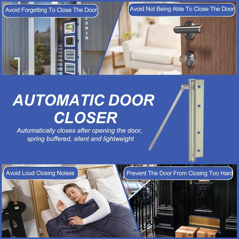 The spring door closer converts a hinged door into an automatic closing door, providing convenience for users who do not have to close the door manually every time. The closing arm can swing 150°, which is suitable for a variety of doors.