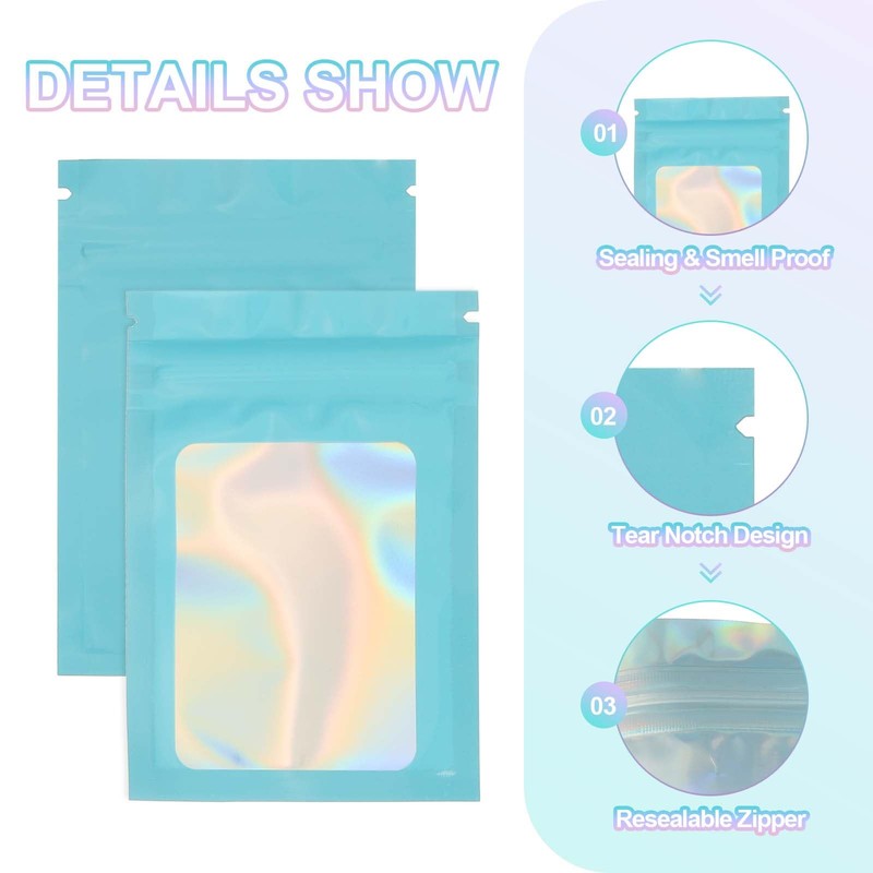 - Color: Blue; Material: Laser film + CPP; Overall Size: 18x26 cm/7.09x10.24 Inch; Packing List: 100 Pcs Foil Pouch Bags