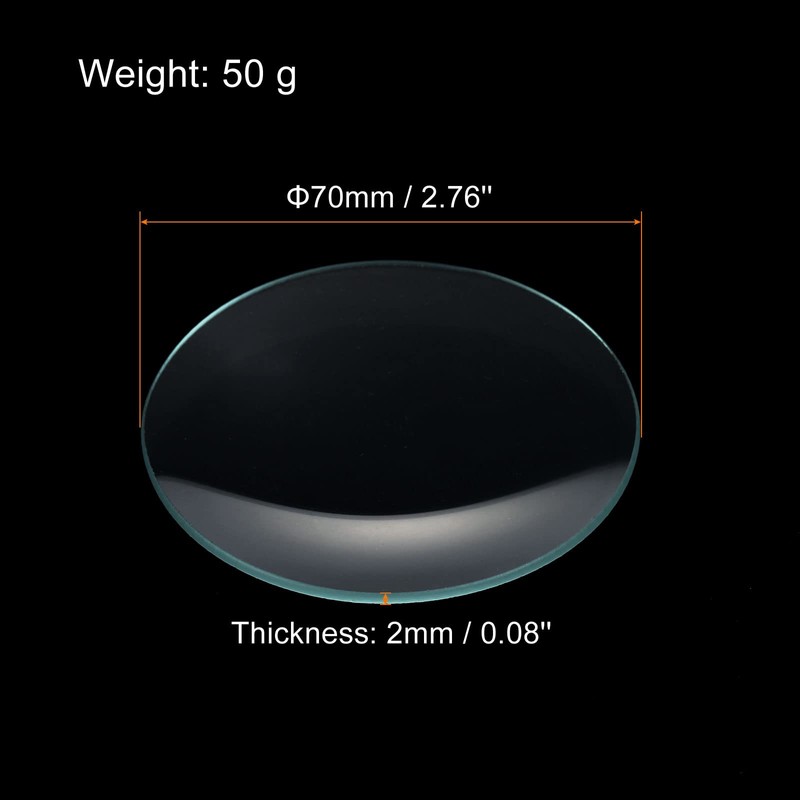 - Color: Clear; Material: Glass; Diameter: 70 mm; Thickness: 2 mm; Weight: 50 g; Package Content: 3 x Watch Glass
