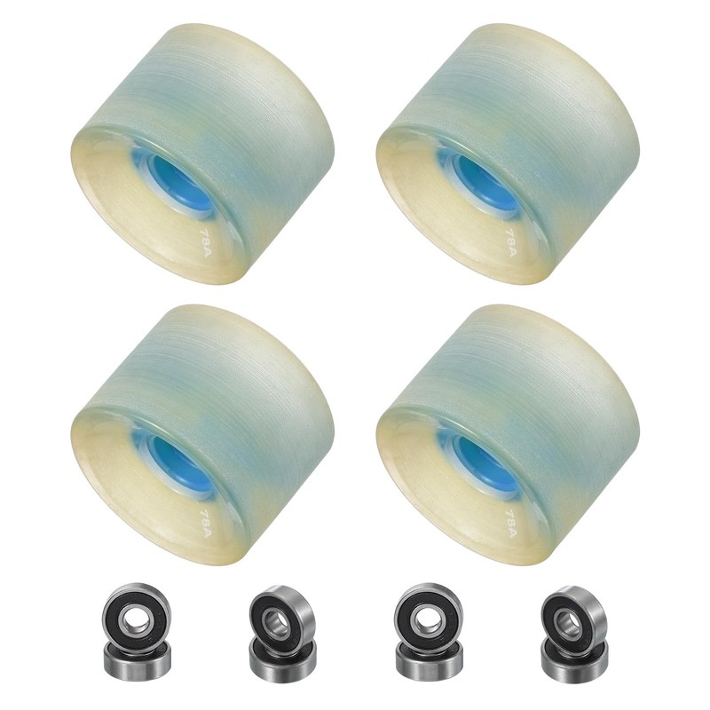 - Color: Transparent Blue; Material: PU; Hardness: 78A; Wheel Size: 70 x 51 mm / 2.76 x 2 Inch (OD*W); Bearing Size: 8 x 22 x 7 mm / 0.31 x 0.87 x 0.28 Inch (OD*ID*W); Package List: 1 Set x Skateboard Wheels with 608RS Bearings (4 x PU Wheels, 8 x 608RS Bearings)