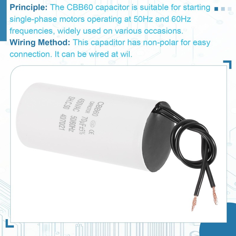 - Instruction: The running capacitor is stable under high temperatures with effective heat dissipation. It's non-polar for easy connection and is convenient without polarity concerns.