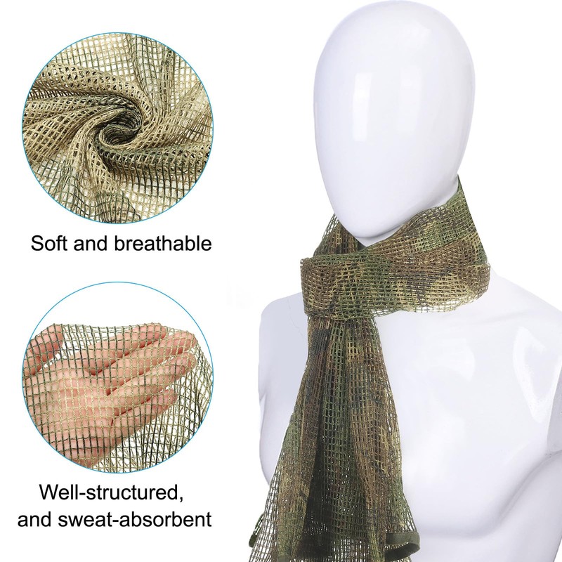 - Color: Leaf Camo, Green; Material: 65% Polyester, 35% Cotton; Overall Size: 180 x 90 cm / 70.9 x 35.4 inch (L*W); Packing List: 2 x Mesh Camo Scarf (1Pcs Each Color)