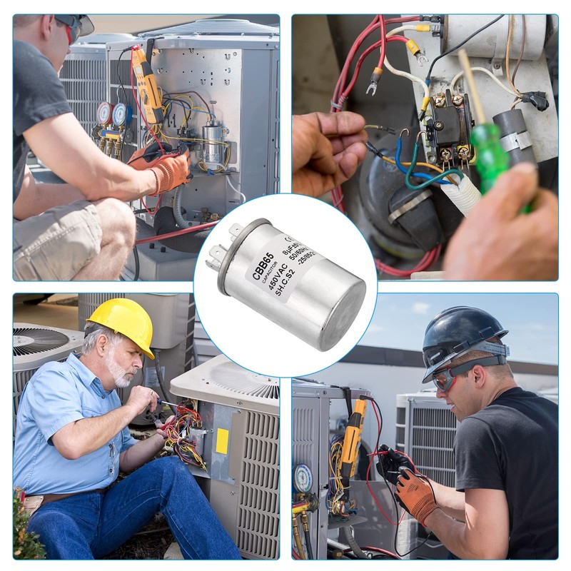 - Specification:Model: CBB65;Material: Metallized Polypropylene, Aluminum Case;Lead End: 2 Terminal (6Pins);Rated Capacity: 8uF;Tolerance: ±5%;Rated Voltage: 450V AC;Rated Frequency: 50/60Hz;Climatic Category: -25/85/21;Overall Size: 40 x 60mm/1.56 x 2.34inch (D x H); Package Includes: 1 x CBB65 Capacitor