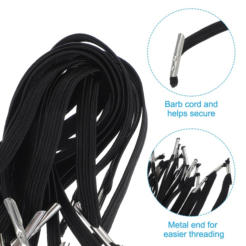 • Application: The elastic barb cord is a flexible and stretchable rope with barbs on each end. It is designed to provide strong fastening and tension to a variety of objects or materials. Widely used in hats, face masks, Halloween masks, crafts or hanging signs, balloons, party decorations, costume parties, badges, banners, and crafting book binding, etc.