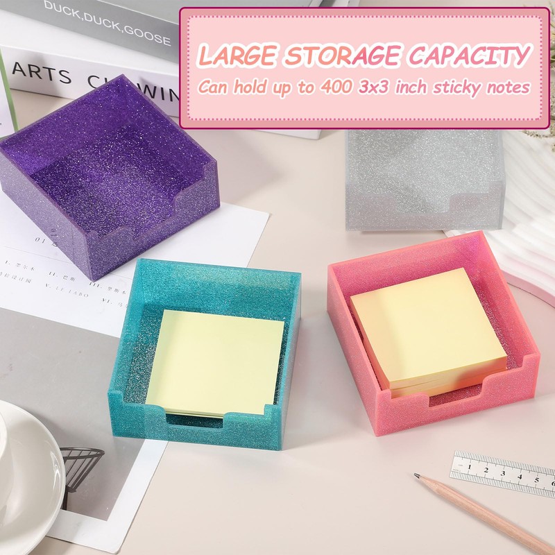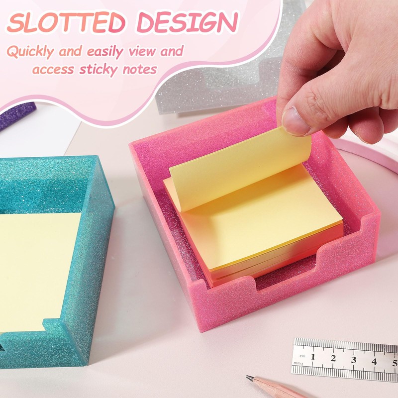 - Application: This sticky note holder can improve your desktop organization and is a space-saving solution for any table or desk. Suitable for most notes, it is not only a note pad box, but also can be used to store clips, erasers, hairpins, hair bands, beads, jewelry, or other small crafts etc.