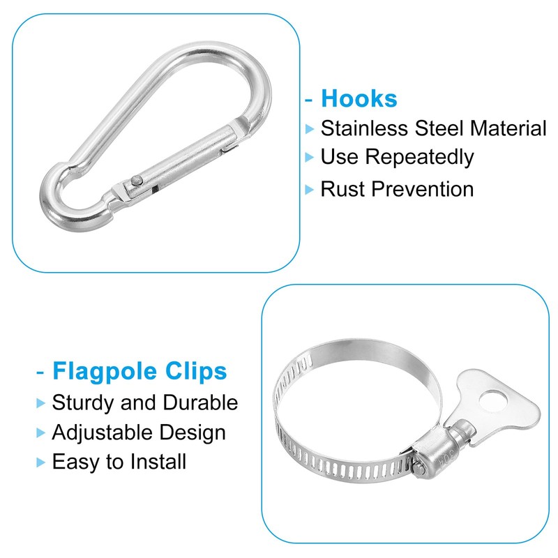 - Advantages: The set of flagpole clips and hooks is made of a combination of stainless steel, with a smooth and thorough surface, a durable and beautiful appearance, rust prevention, strong grip, and resistance to severe weather. The flagpole clip built-in key is turned left or right the diameter can be adjustable.