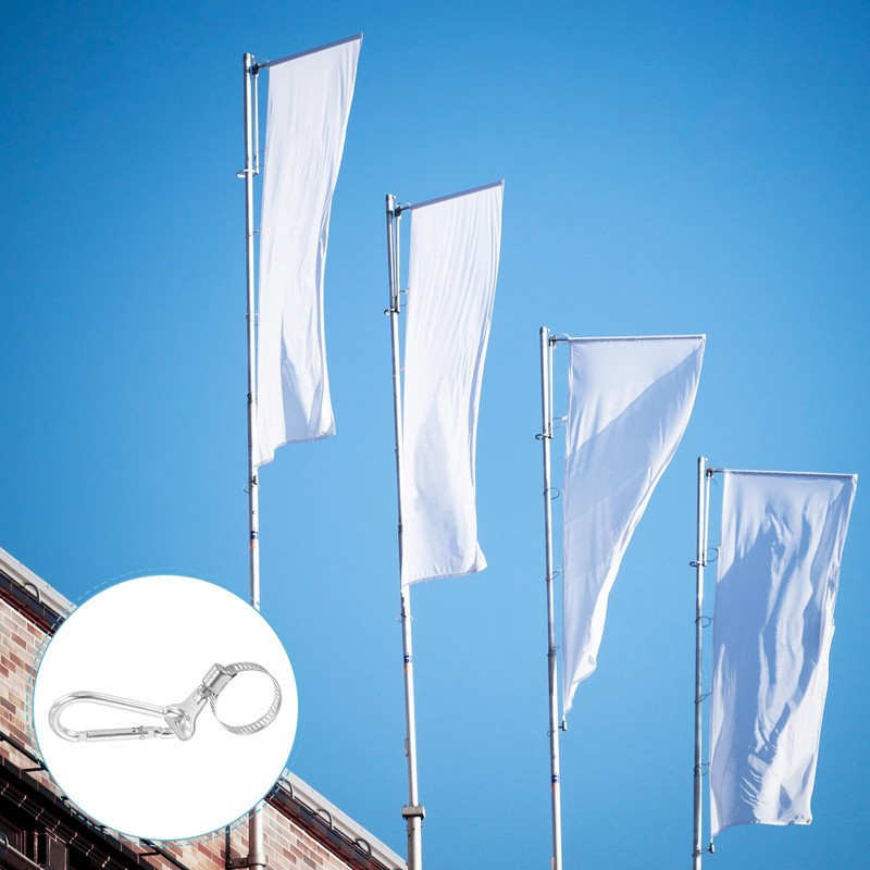 The set of flagpole clips and hooks is made of a combination of stainless steel, with a smooth and thorough surface, a durable and beautiful appearance, rust prevention, strong grip, and resistance to severe weather. The flagpole clip built-in key is turned left or right the diameter can be adjustable.