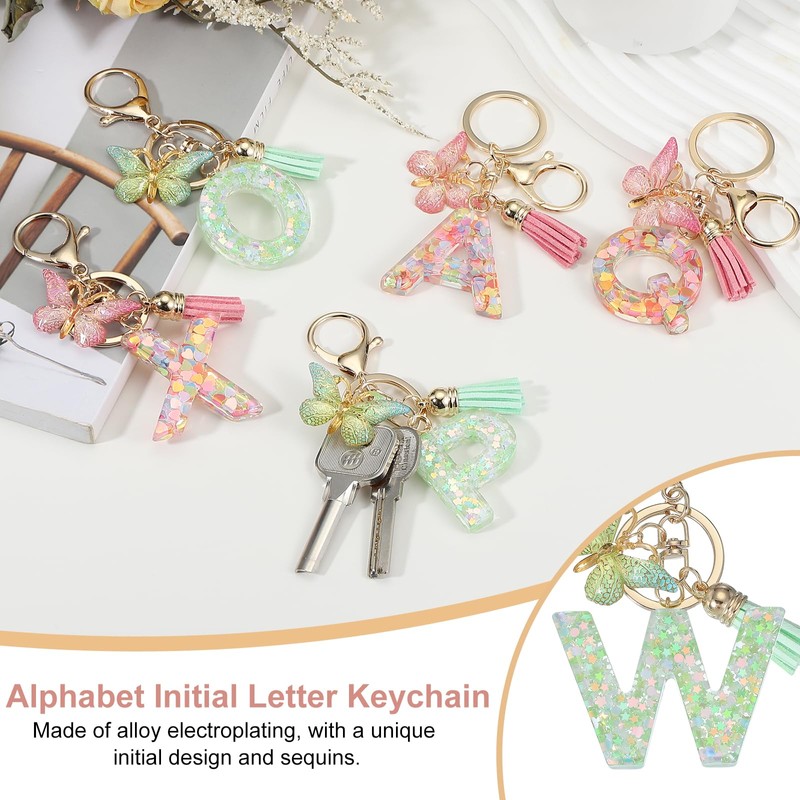 - Advantage: This cute letter keychain comes with tassels and butterfly pendants and is made of epoxy resin material, which is hard and does not deform. The keyring is made of alloy electroplating, with a unique initial design and sequins, which are gorgeous and beautiful