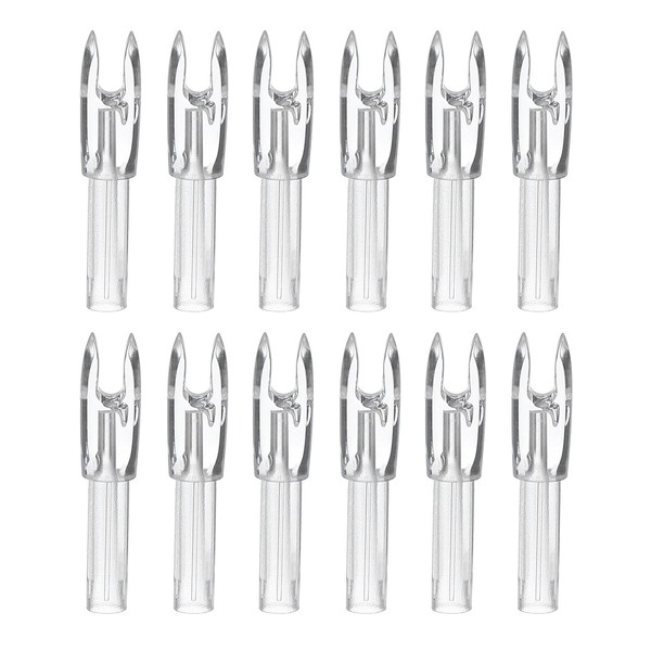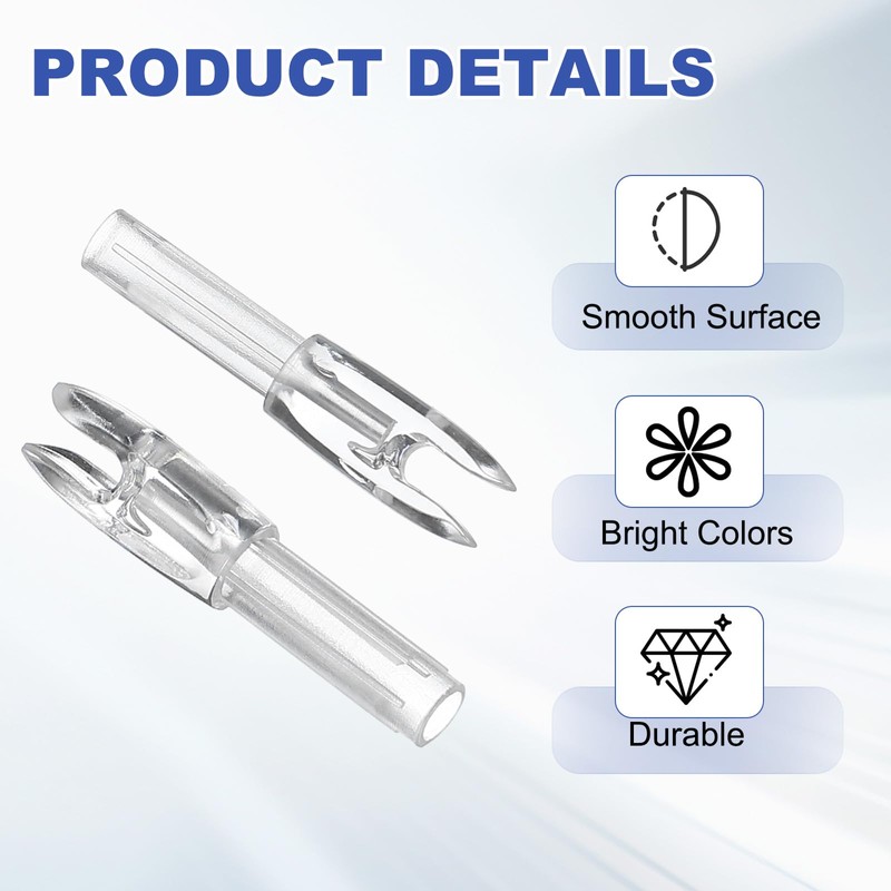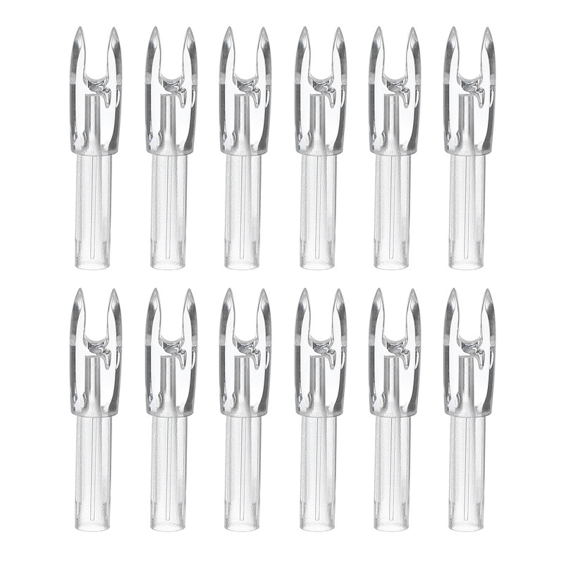 - Color: Clear; Material: Plastic; Size: 6 x 27.1 mm / 0.24 x 1.06 Inch (W x L); Inner Diameter: 4.2 mm / 0.16 Inch; Packing List: 12 x Mini Arrow Nocks